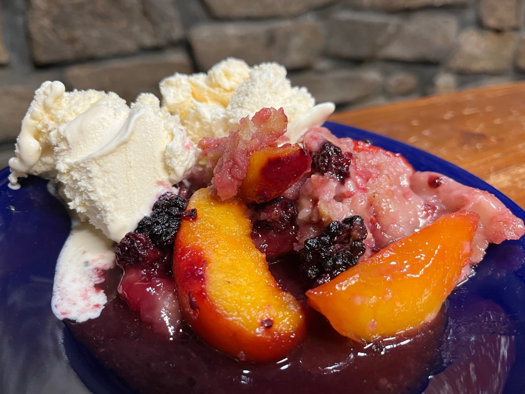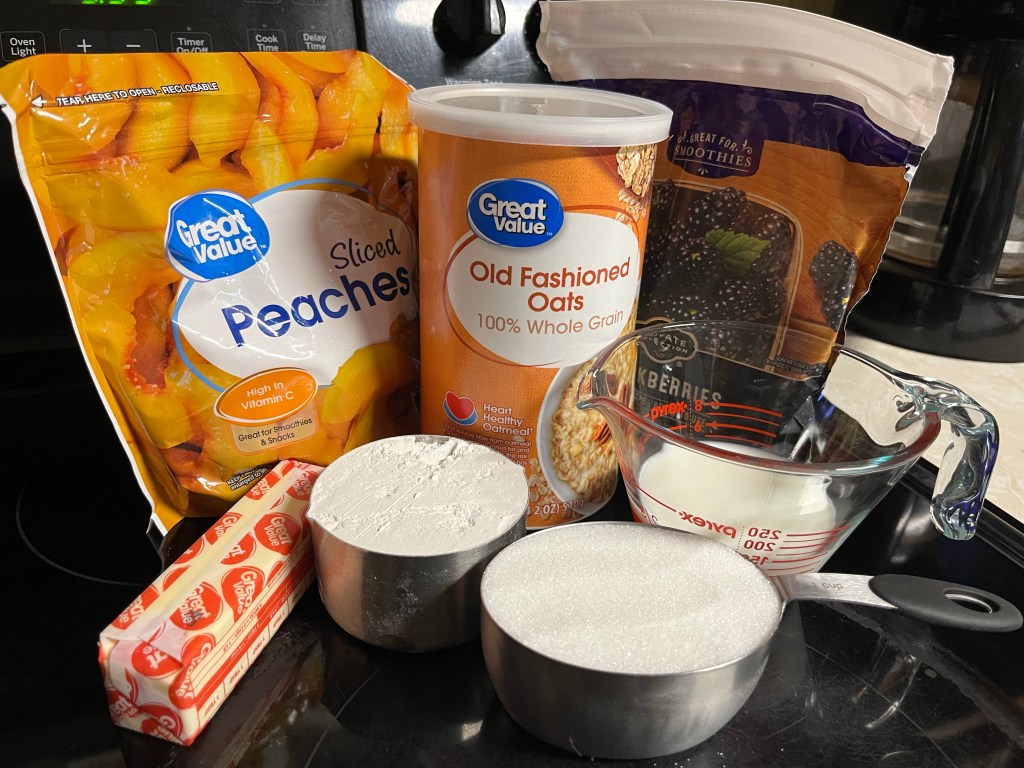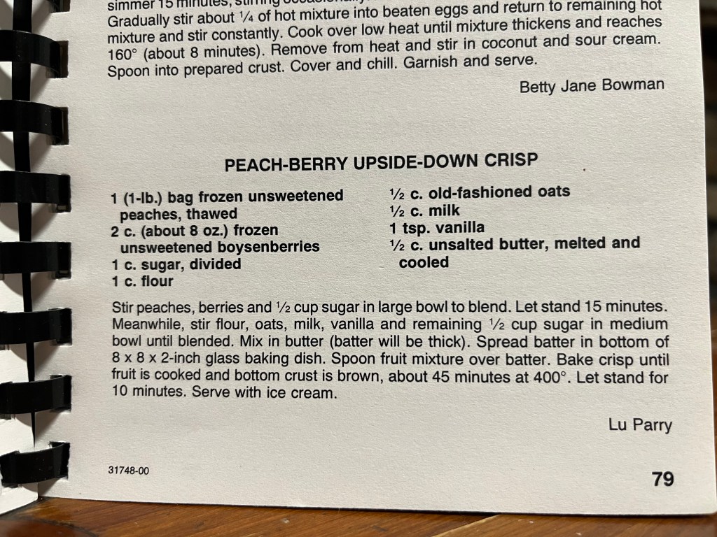 While flipping thru the pages of the cookbook, Peach-Berry Upside-Down Crisp caught my eye. Reading the ingredients, I had to look up what a boysenberry even was😆 Apparently, it’s a cross between blackberry, dewberry, raspberry and a loganberry. No wonder I was confused! I used blackberries instead 🤷🏻♀️