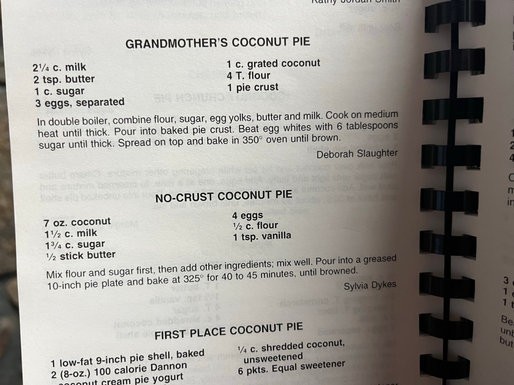 While combing thru, “A Taste Of Heaven, Jackson Street United Methodist Church”, I found a recipe for No Crust Coconut Pie.